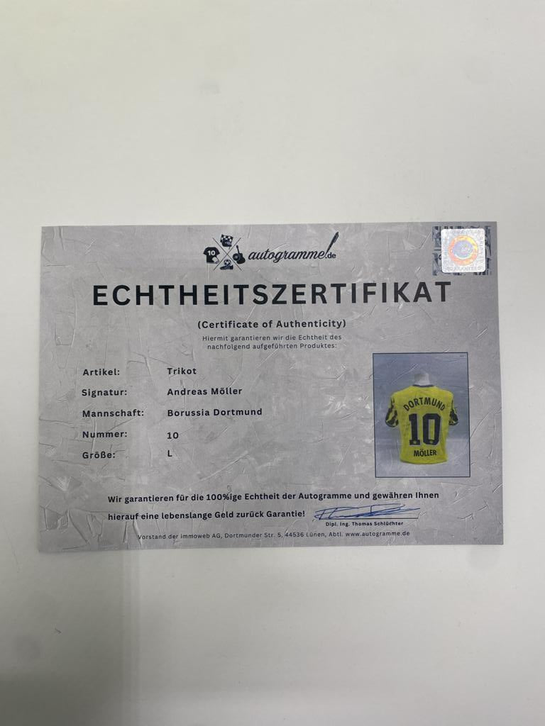 Hier erhalten Sie die Möglichkeit, ein von Andreas Möller persönlich signiertes BVB Trikot in der Größe L zu erwerben. Das Trikot ist ungetragen, das Etikett ist vorhanden. Über die Echtheit der Unterschrift erhalten Sie ein Echtheitszertifikat mit lebenslanger Geld-Zurück-Garantie! Der auf dem Trikot befindliche Hologrammaufkleber (Siehe Bilder) stellt die Verbindung zum Zertifikat dar.