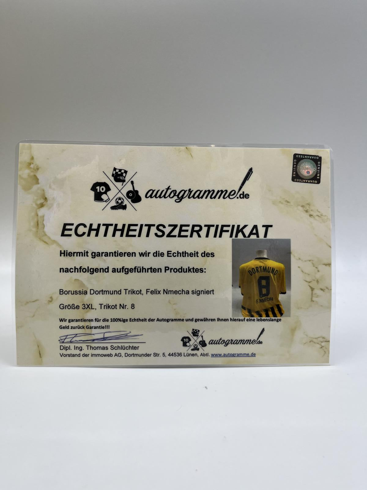 Here you have the opportunity to receive a personally signed Borussia Dortmund Jersey in size 3XL The jersey is unworn and the tag is present. You will receive a certificate of authenticity with a lifetime money-back guarantee confirming the authenticity of the signature. The hologram sticker on the jersey (see pictures) represents the connection to the certificate.