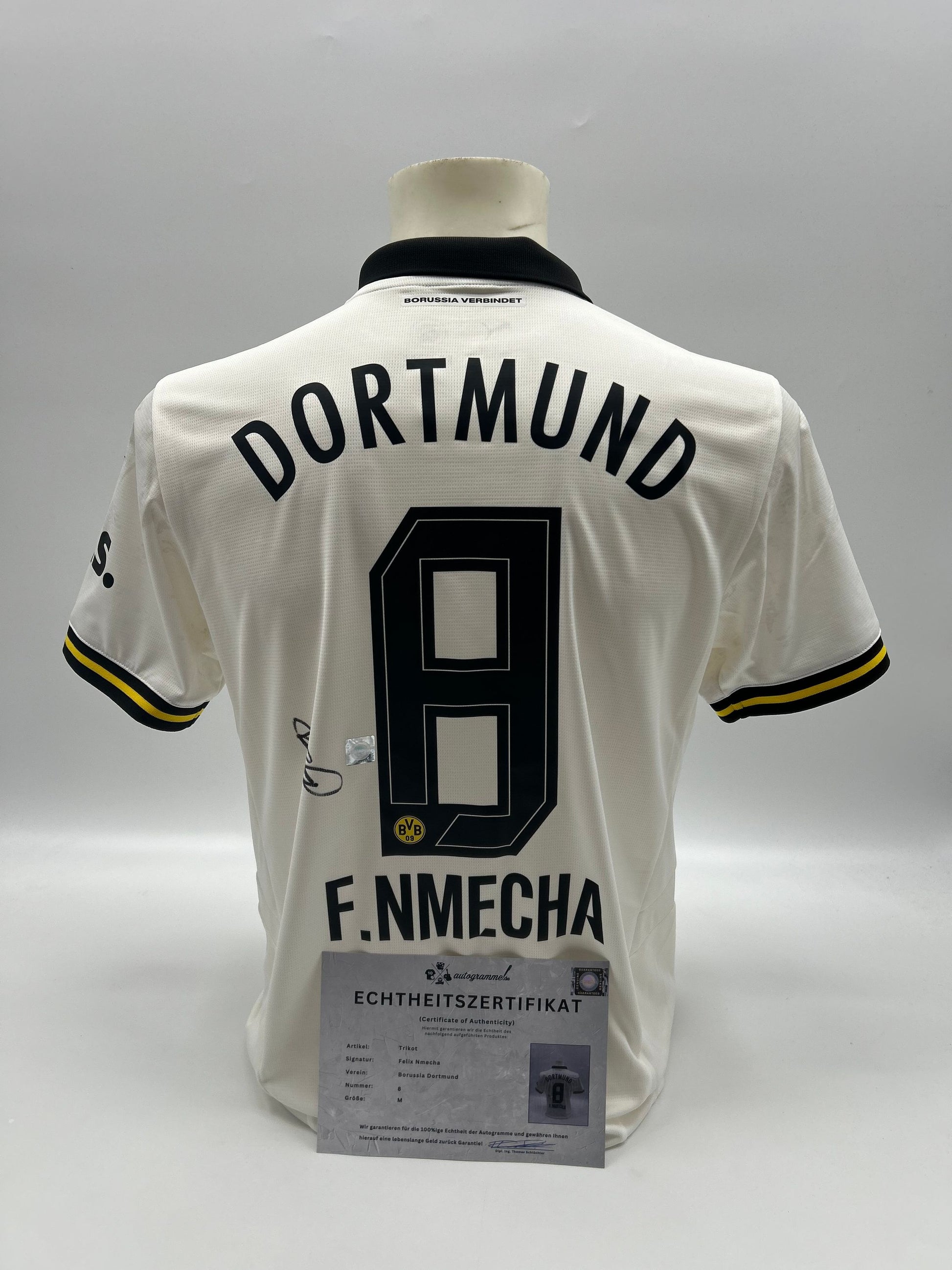 Here you have the opportunity to receive a personally signed copy by Felix Nmecha. Borussia Dortmund Jersey in size M The jersey is unworn and the tag is present. You will receive a certificate of authenticity with a lifetime money-back guarantee confirming the authenticity of the signature. The hologram sticker on the jersey (see pictures) represents the connection to the certificate.