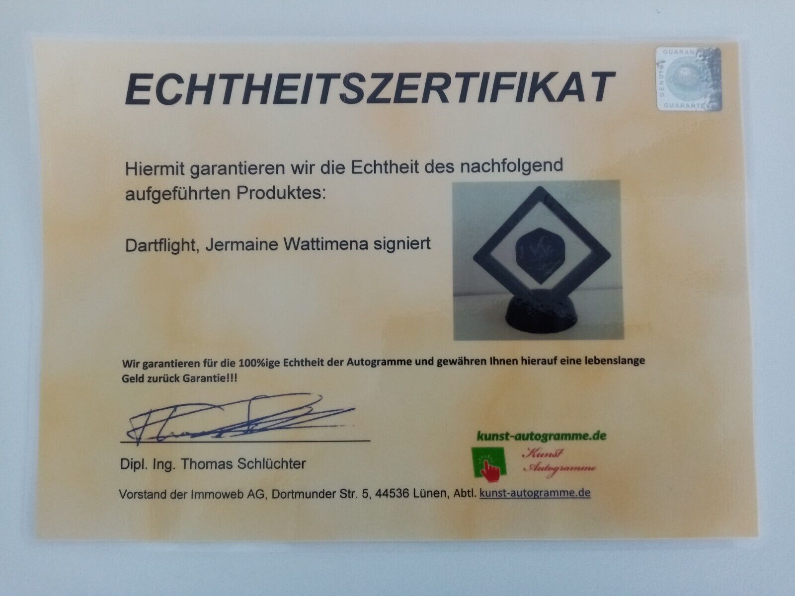 Here you have the opportunity to purchase a dart flight personally signed by Jermaine Wattimena. The flight is new and unused. You will receive a certificate of authenticity with a lifetime money-back guarantee confirming the authenticity of the signature! The flight is housed in a small display case measuring 10 x 10 cm.