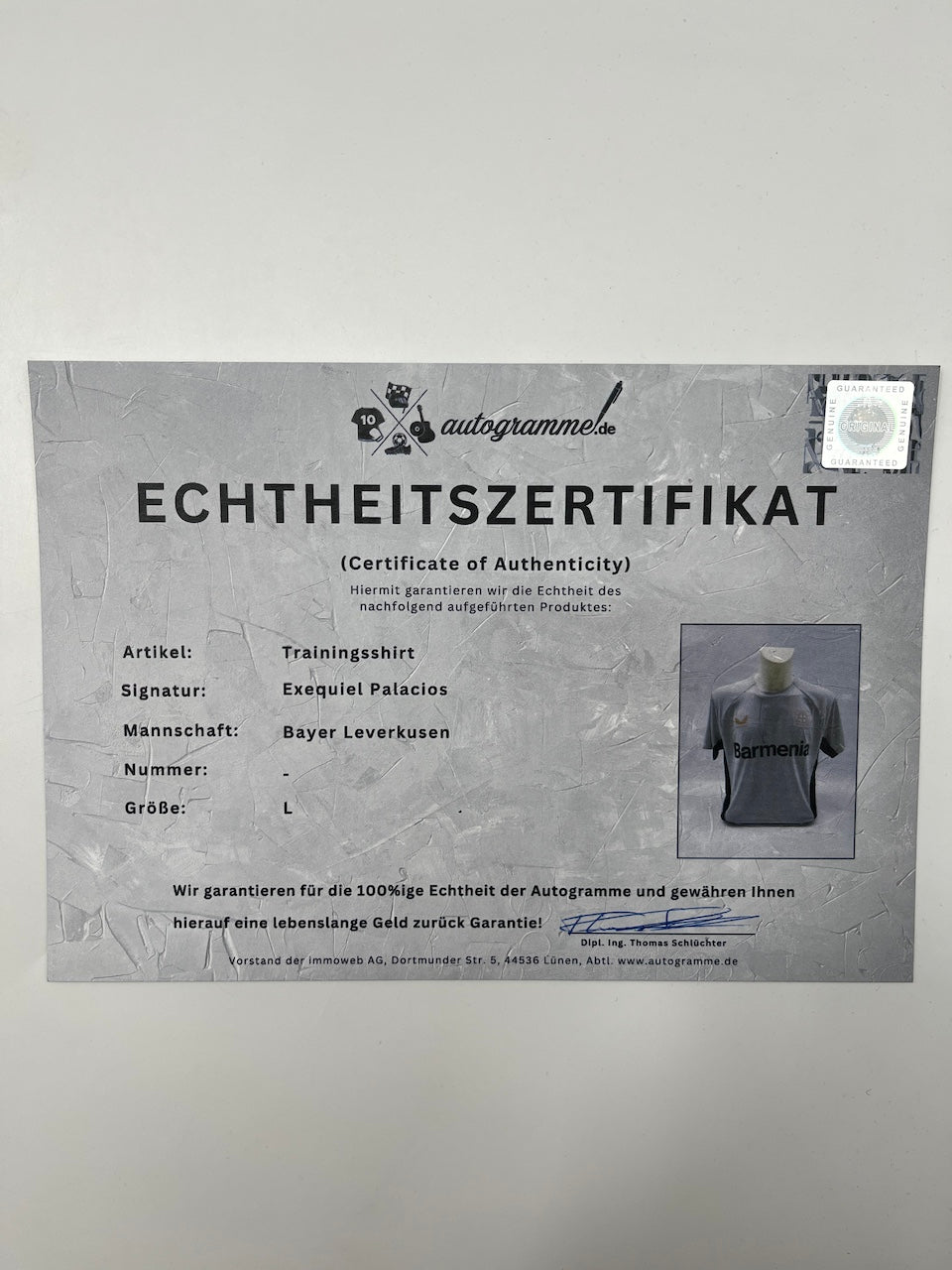 Hier erhalten Sie die Möglichkeit, ein von Exequiel Palacios persönlich signiertes Bayer Leverkusen Trainingsshirt in der Größe L zu erwerben. Das Trikot ist Neu, das Etikett ist vorhanden. Es befindet sich ein sehr kleines Loch auf der Vorderseite des Trikots (Siehe Bilder). Über die Echtheit der Unterschrift erhalten Sie ein Echtheitszertifikat mit lebenslanger Geld-Zurück-Garantie. Der auf dem Trikot befindliche Hologrammaufkleber (Siehe Bilder) stellt die Verbindung zum Zertifikat dar.