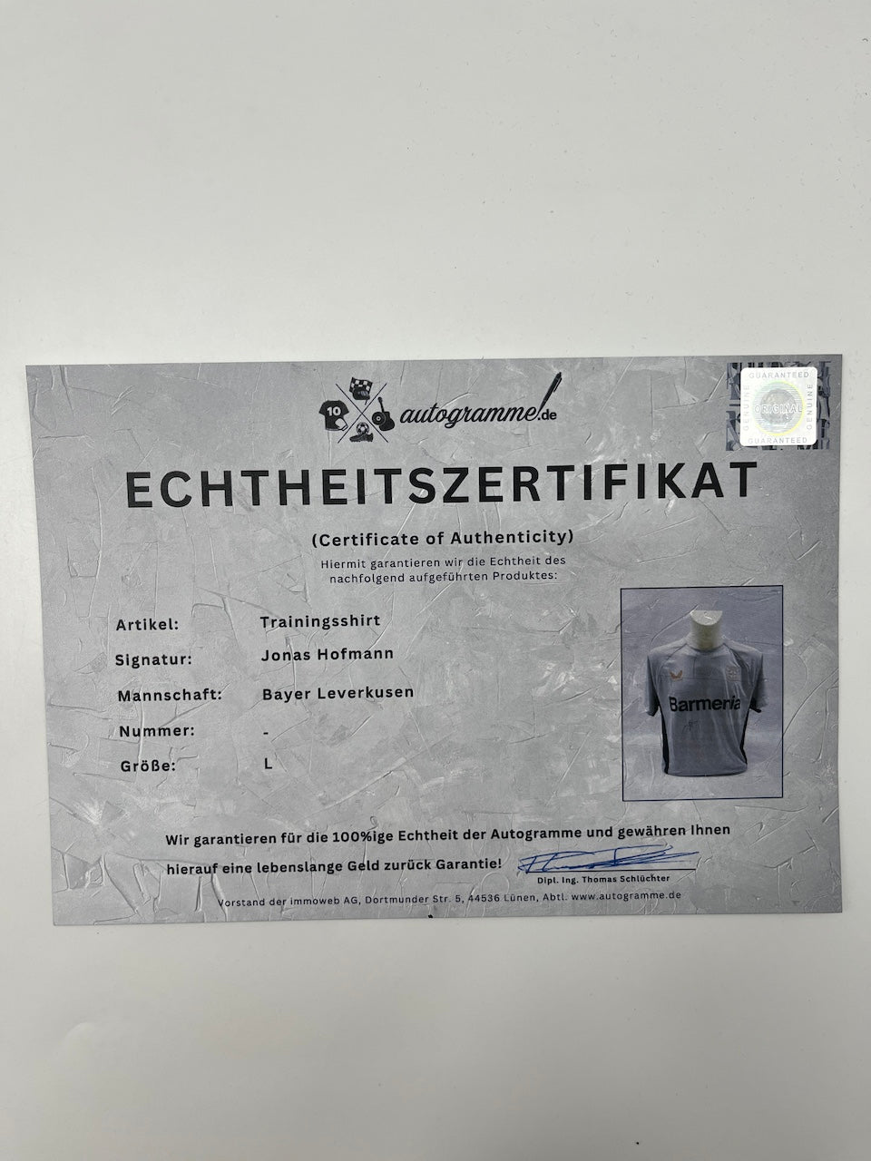 Hier erhalten Sie die Möglichkeit, ein von Jonas Hofmann persönlich signiertes Bayer Leverkusen Trainingsshirt in der Größe L zu erwerben. Das Trikot ist Neu, das Etikett ist vorhanden. Über die Echtheit der Unterschrift erhalten Sie ein Echtheitszertifikat mit lebenslanger Geld-Zurück-Garantie. Der auf dem Trikot befindliche Hologrammaufkleber (Siehe Bilder) stellt die Verbindung zum Zertifikat dar.
