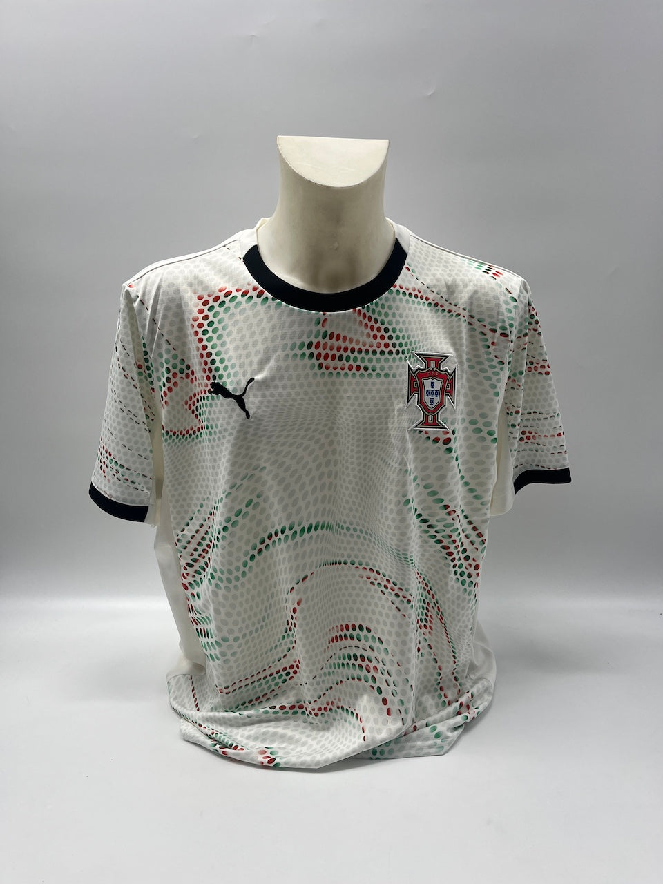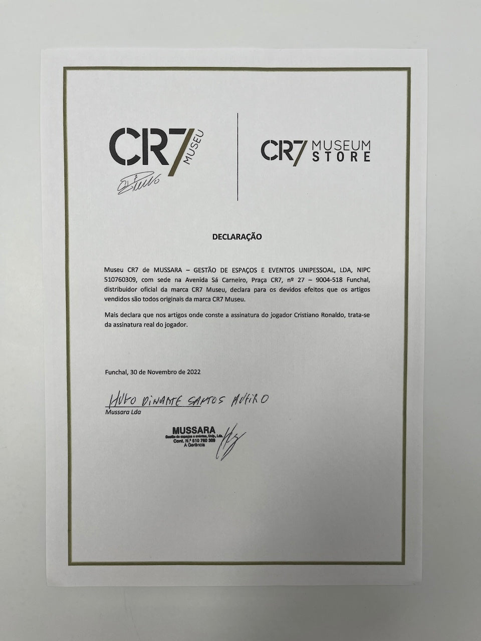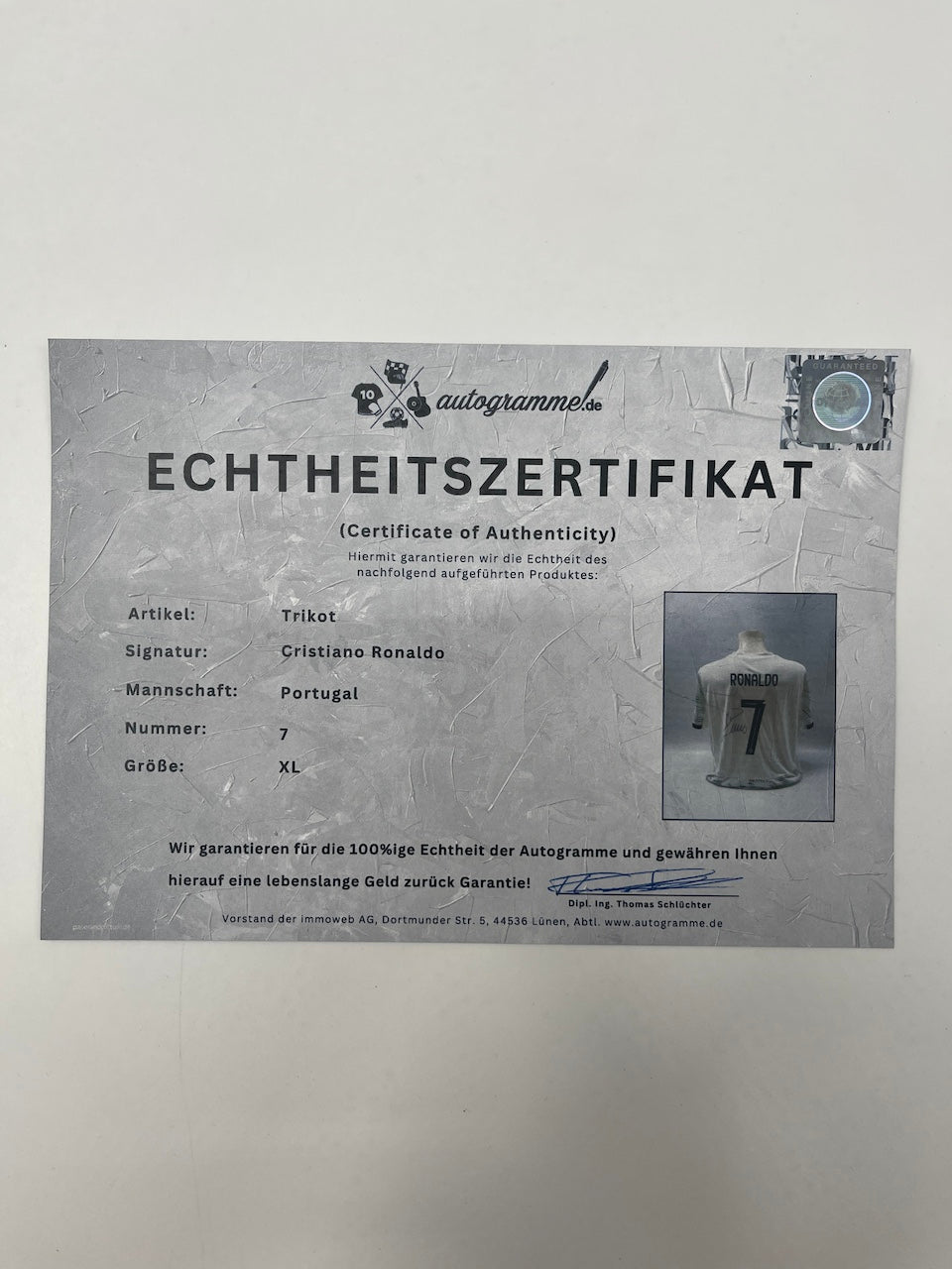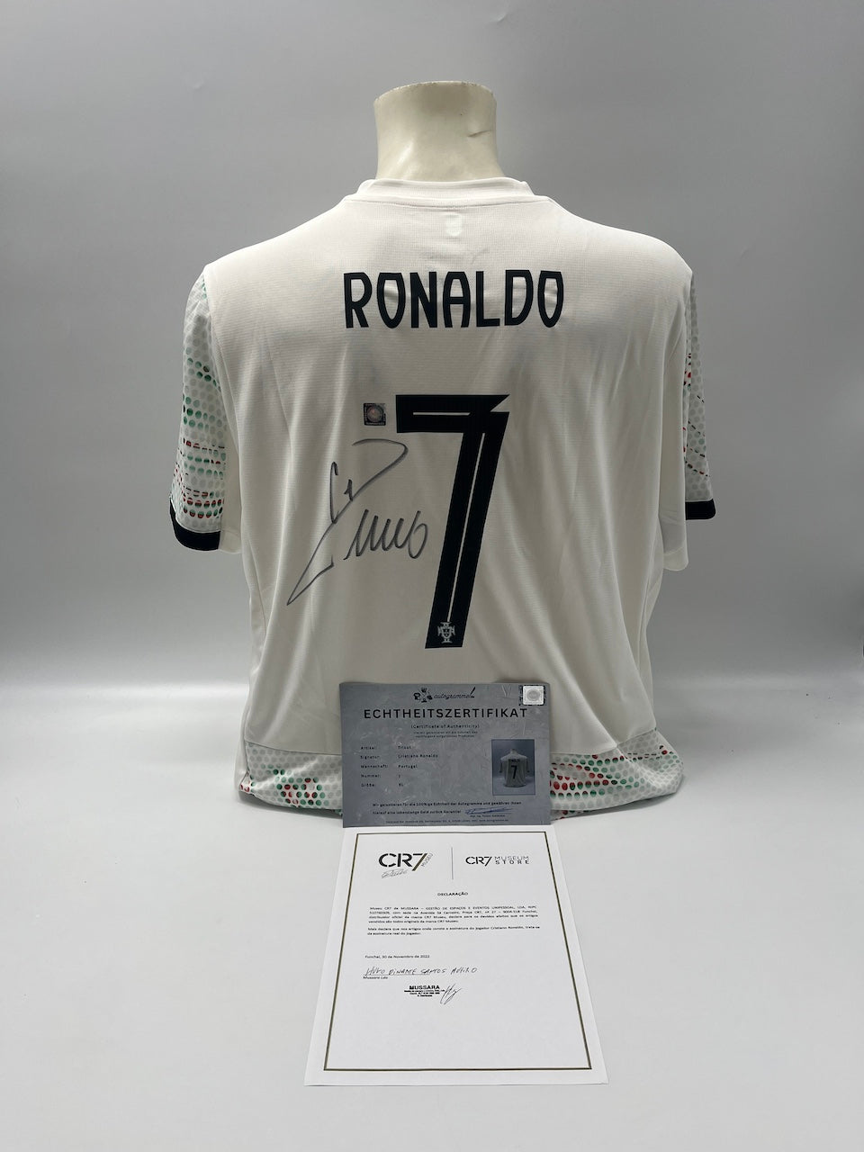 Hier erhalten Sie die Möglichkeit, ein von Cristiano Ronaldo persönlich signiertes Portugal Trikot in der Größe XL zu erwerben. Das Trikot ist ungetragen, das Etikett ist vorhanden. Es wurde im CR7 Museum in Madeira (Portugal) erworben. Als Bescheinigung darüber befindet sich die Kaufquittung im Anhang. Das Trikot ist nur sehr selten vor Ort verfügbar und streng limitiert. Mit Registrierung bekommt jeweils nur eine Person ein Trikot, allerdings nicht online. Über die Echtheit der Unterschrift erhalten Sie ein Echtheitszertifikat vom Ronaldo Museum und eines von uns mit lebenslanger Geld-Zurück-Garantie.